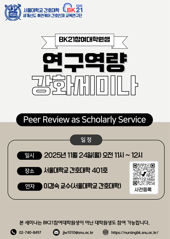 4단계 BK21 세계선도 휴먼케어 간호인재 교육연구단에서는 2025학년 2학기 참여대학원생 연구역량강화세미나를 진행합니다.